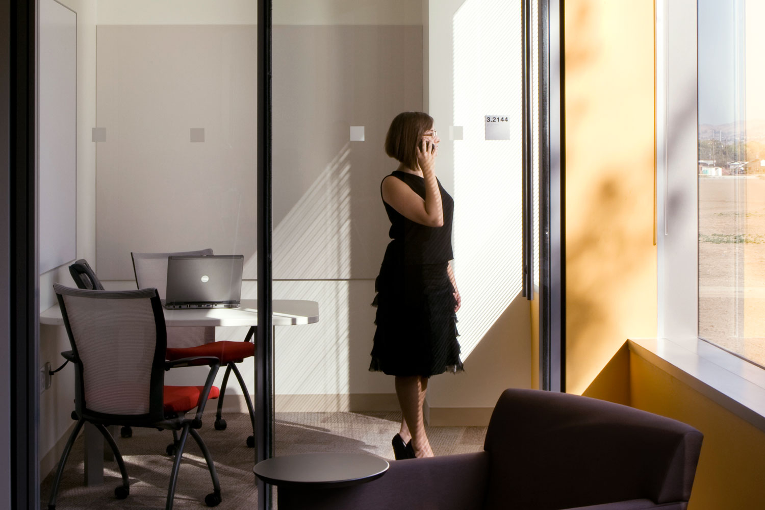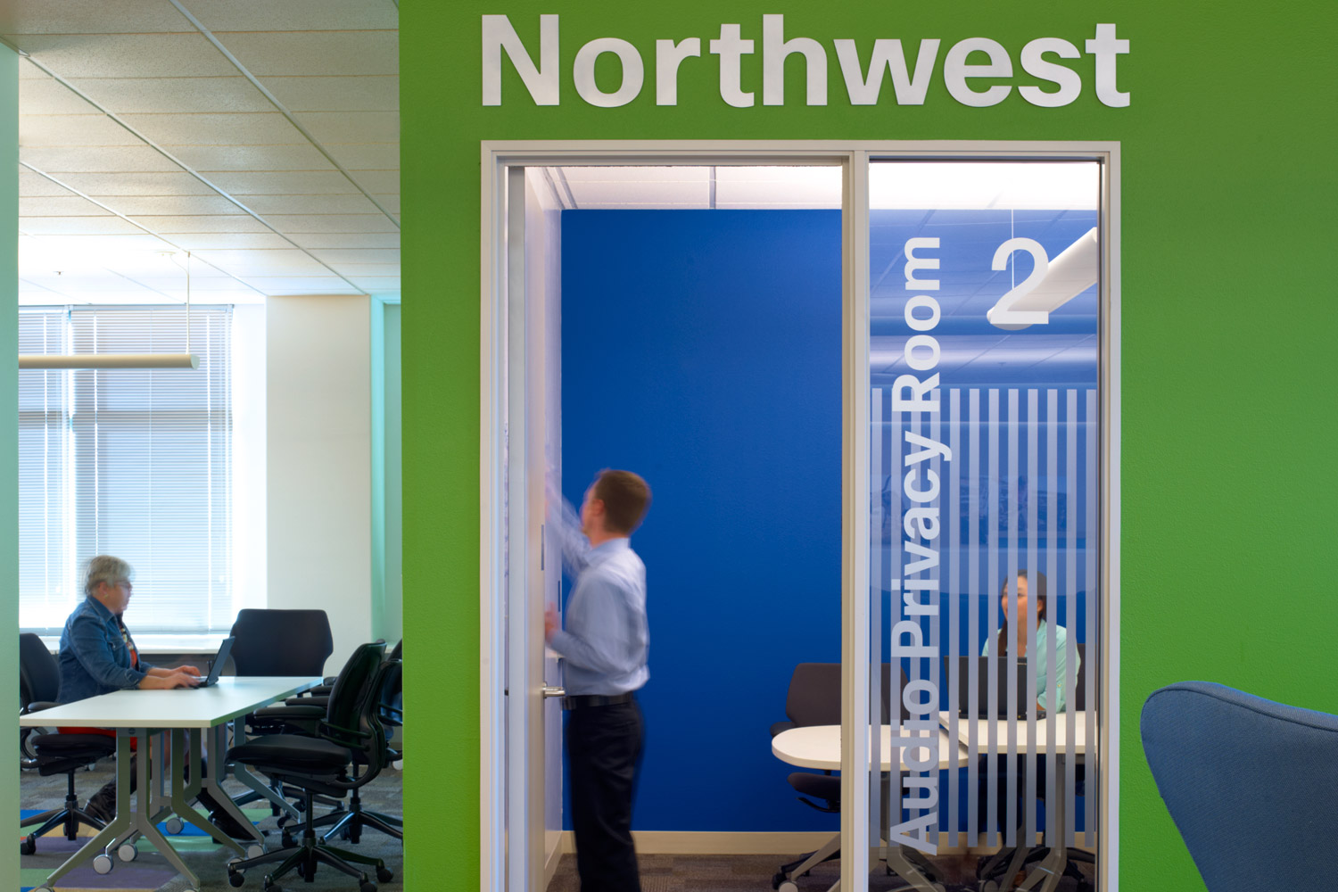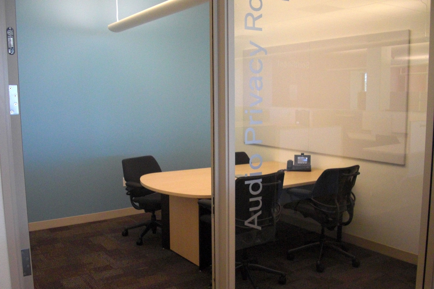 Audio privacy rooms (APRs) are nonbookable, enclosed collaboration spaces that support informal meetings between team members, conference calls, confidential and personal conversations and concentrated group work. They are located in all neighborhoods, and glazed walls provide visual cues to availability.