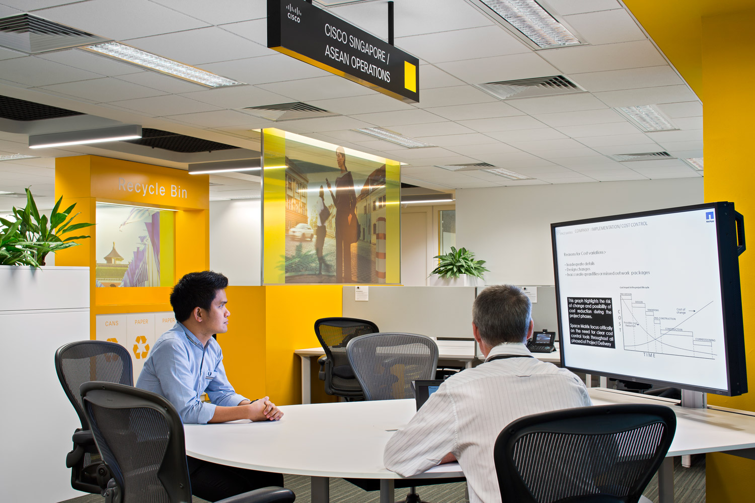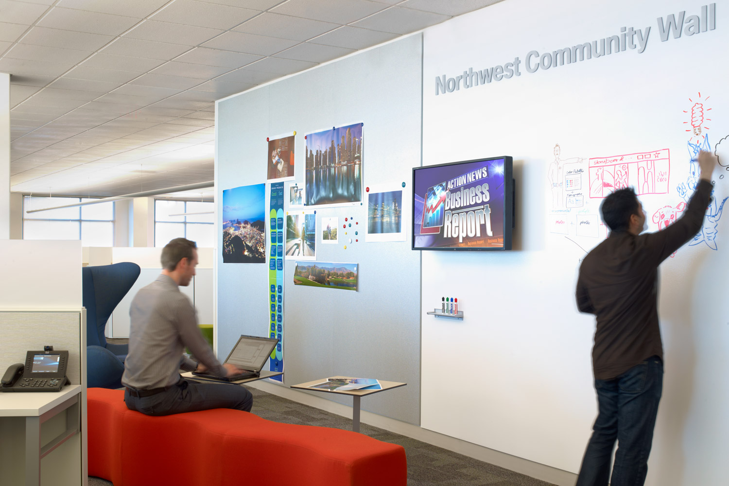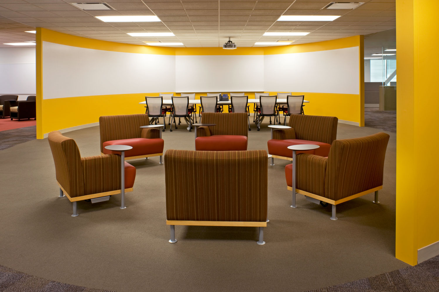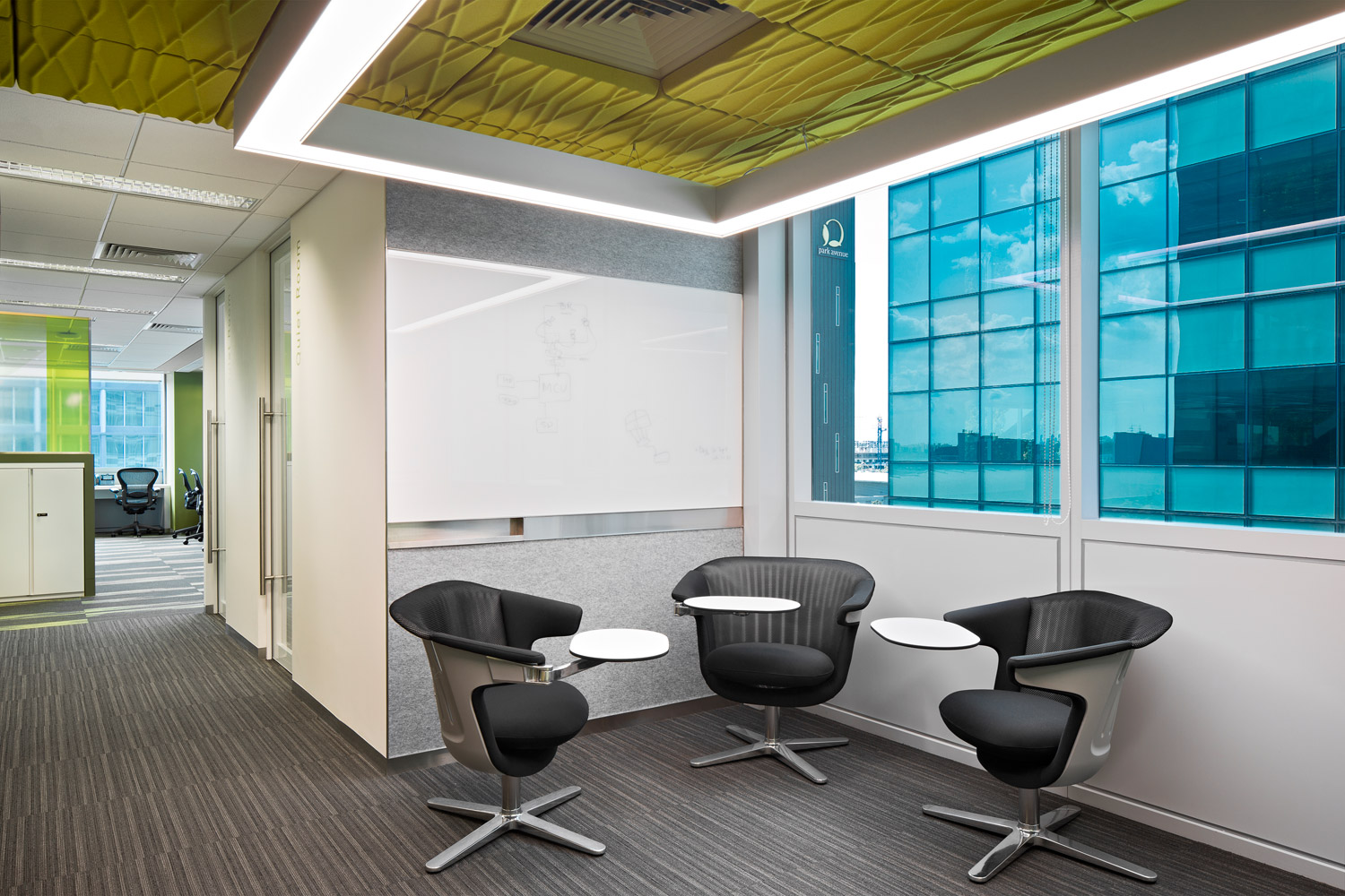 Project areas are nonbookable, semienclosed spaces supporting ad-hoc collaboration by teams. They are located within client neighborhoods and are assigned to teams for long-term use. They are proportionally sized to accommodate the group's size.